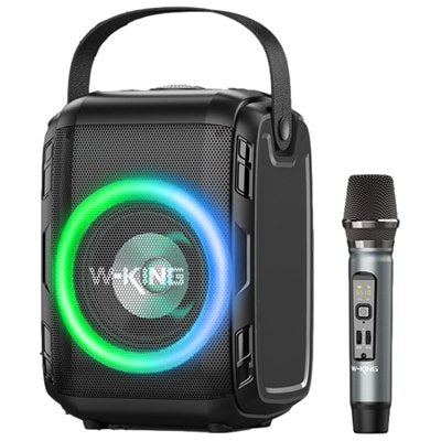 רמקול נייד איכותי מבית W-KING עם עוצמה של 25W, הכולל מיקרופון אלחוטי. מאפשר חיבור Bluetooth למכשירים ניידים, נגינה מכרטיס זיכרון, USB או חיבור AUX – פתרון קומפקטי ונוח לשירה, נאומים והפעלות.
