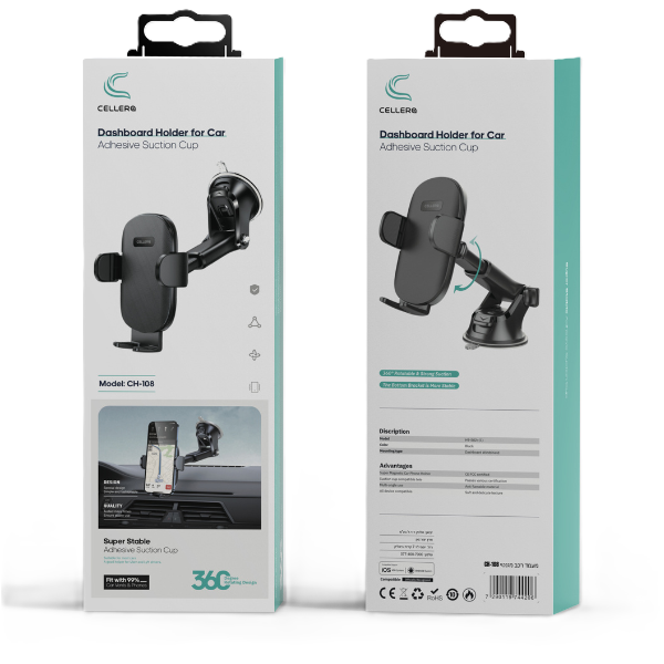 מעמד רכב איכותי מבית CELLERA, מאפשר הצמדת הטלפון בצורה יציבה למשטח הרכב או לשמשה בעזרת וואקום חזק, עם אפשרות כיוון ונוחות מרבית לשימוש בזמן נהיגה.